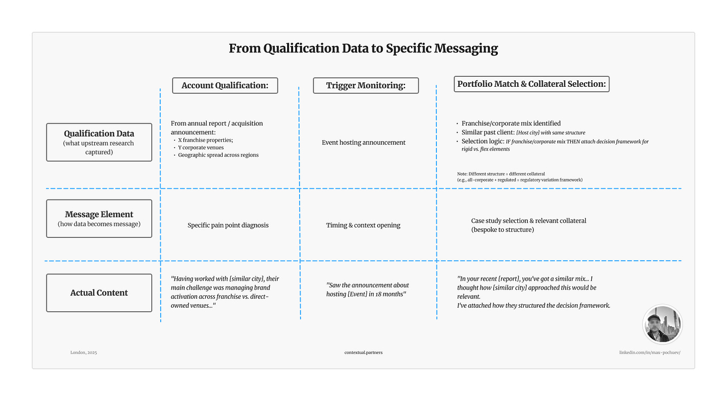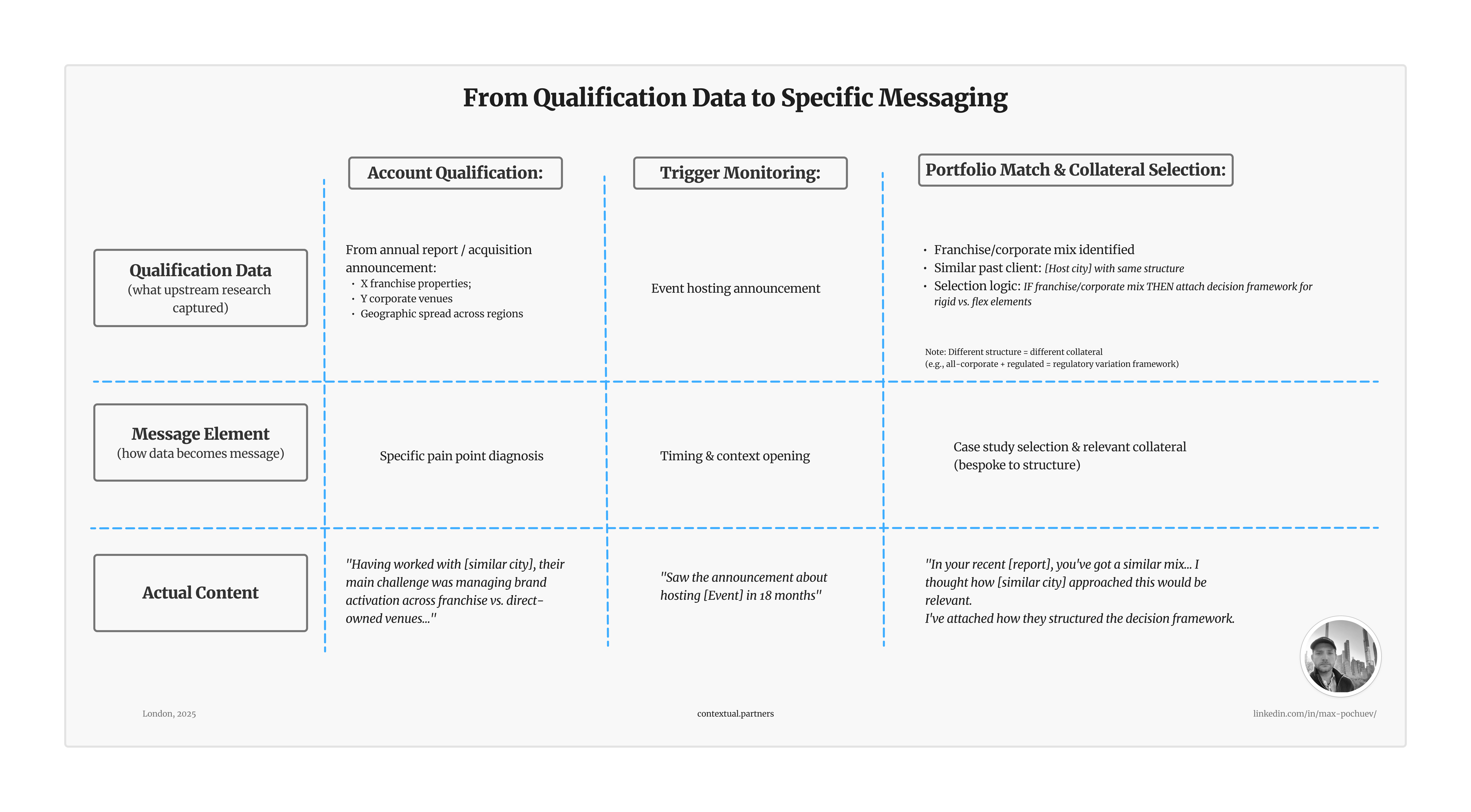 The qualification work—identifying triggers, researching context, selecting case studies—becomes systematic. BDs add their voice, but the research-to-message translation that normally consumes hours per account is now enabled by upstream qualification data.