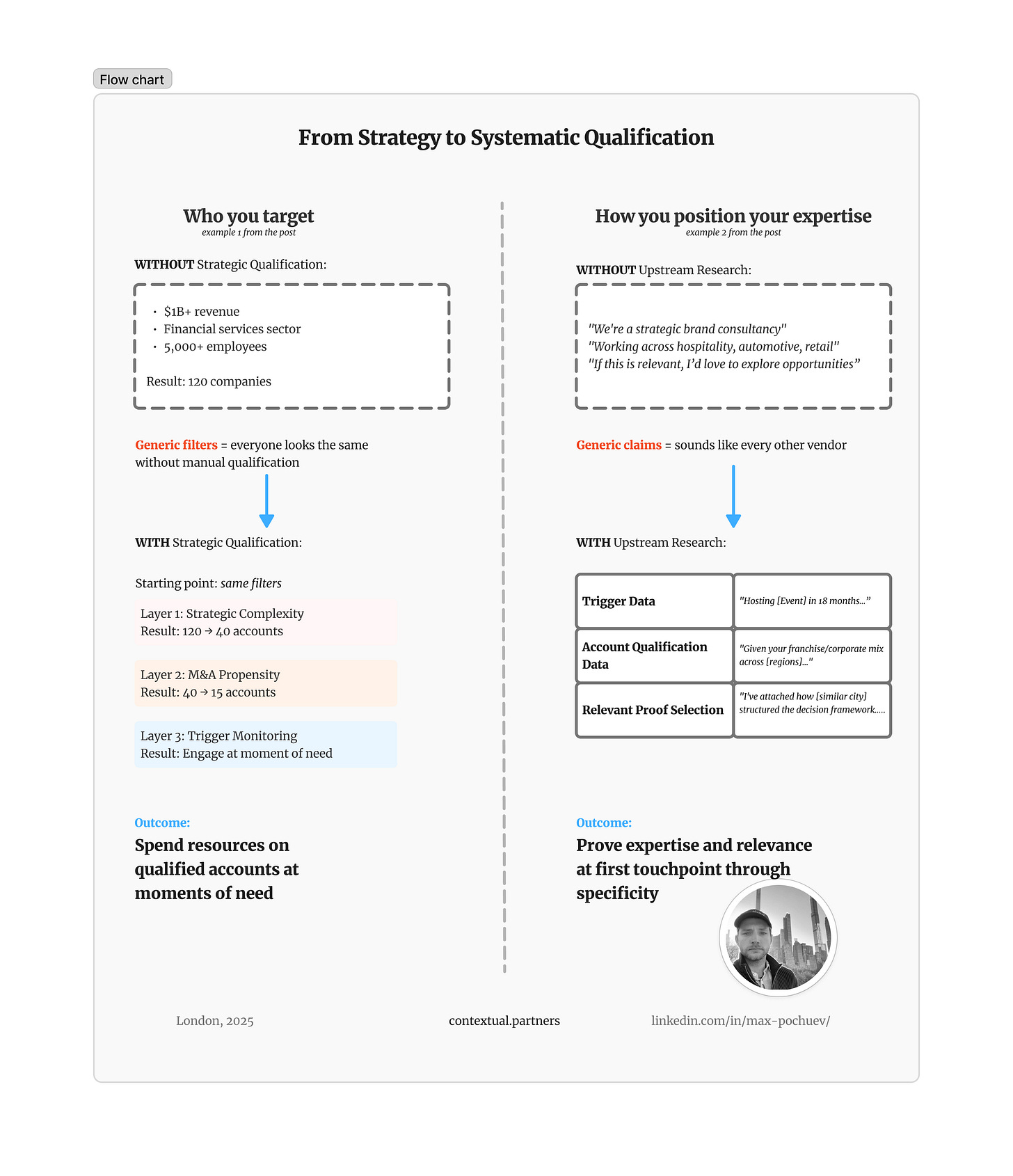 This is where strategic clarity becomes operational infrastructure. No research workflow adds value if built on principles misaligned with how the market perceives your expertise. But once that strategic layer is defined, systematic qualification stops being a bandwidth constraint and becomes a competitive advantage.