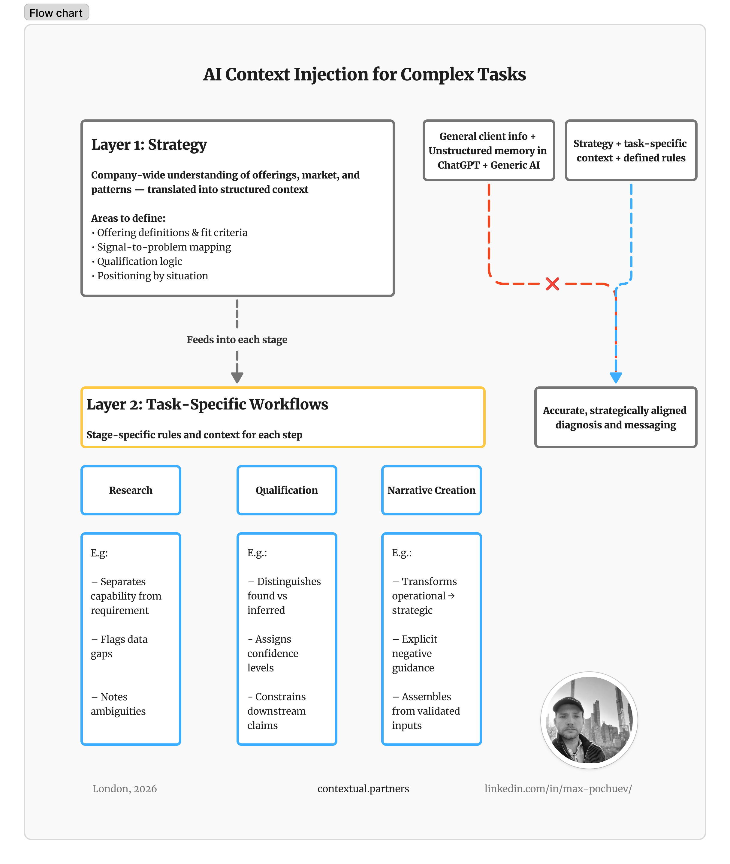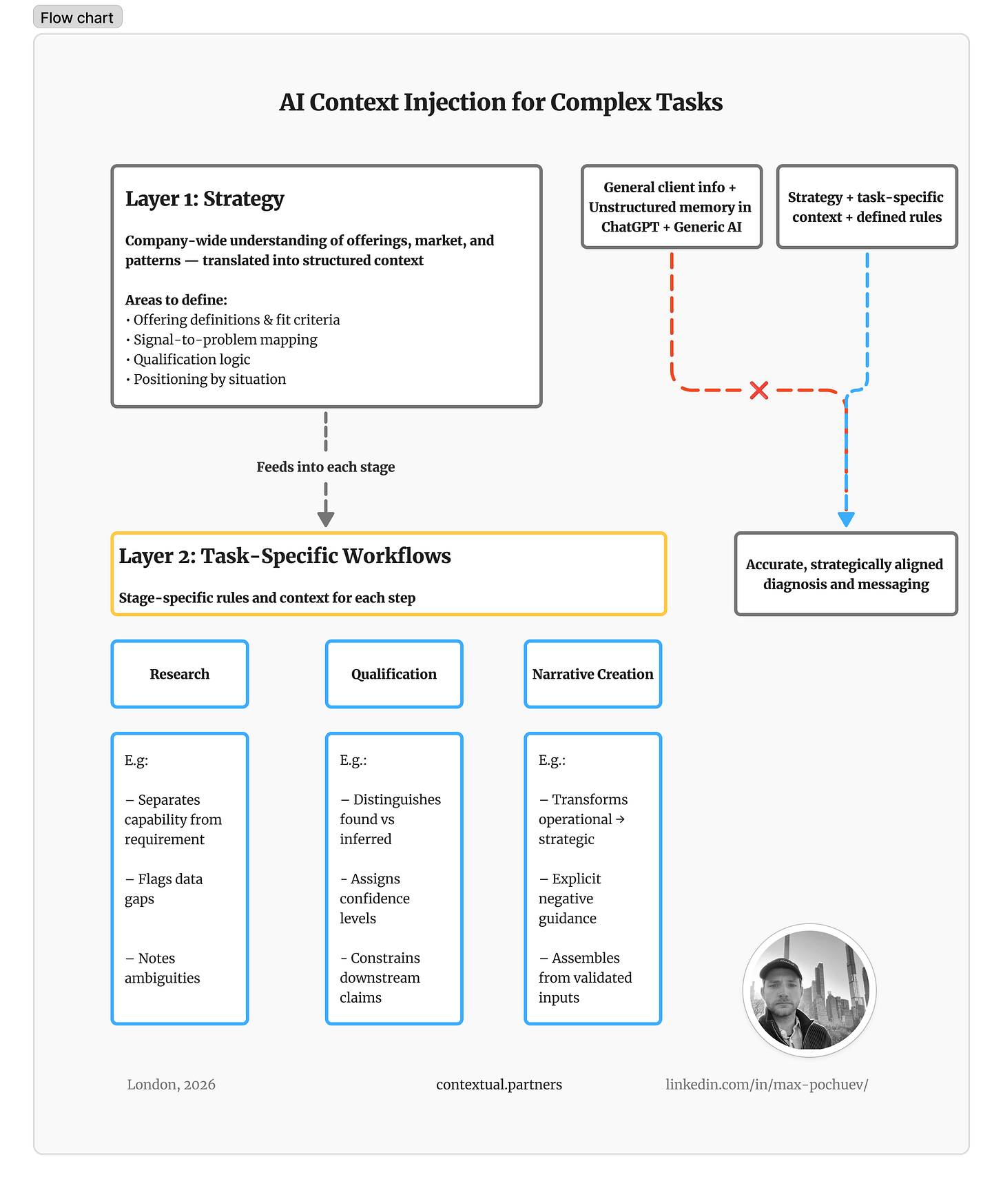 To be clear — this isn’t adding company information to ChatGPT memories or just writing longer prompts. For complex, knowledge-based tasks, context injection involves building purpose-built datasets and decision-making frameworks and rules for each stage of a process.