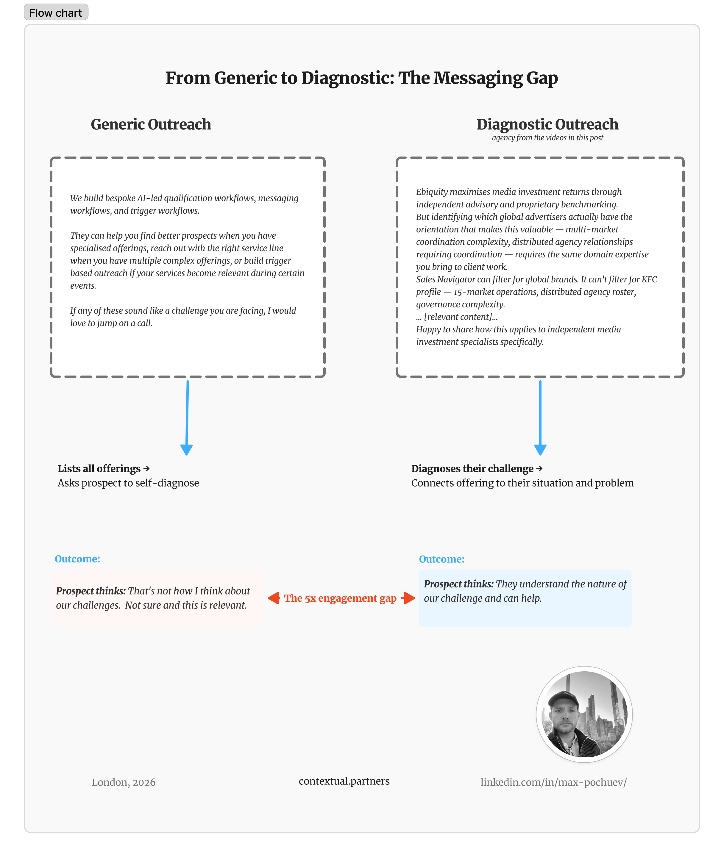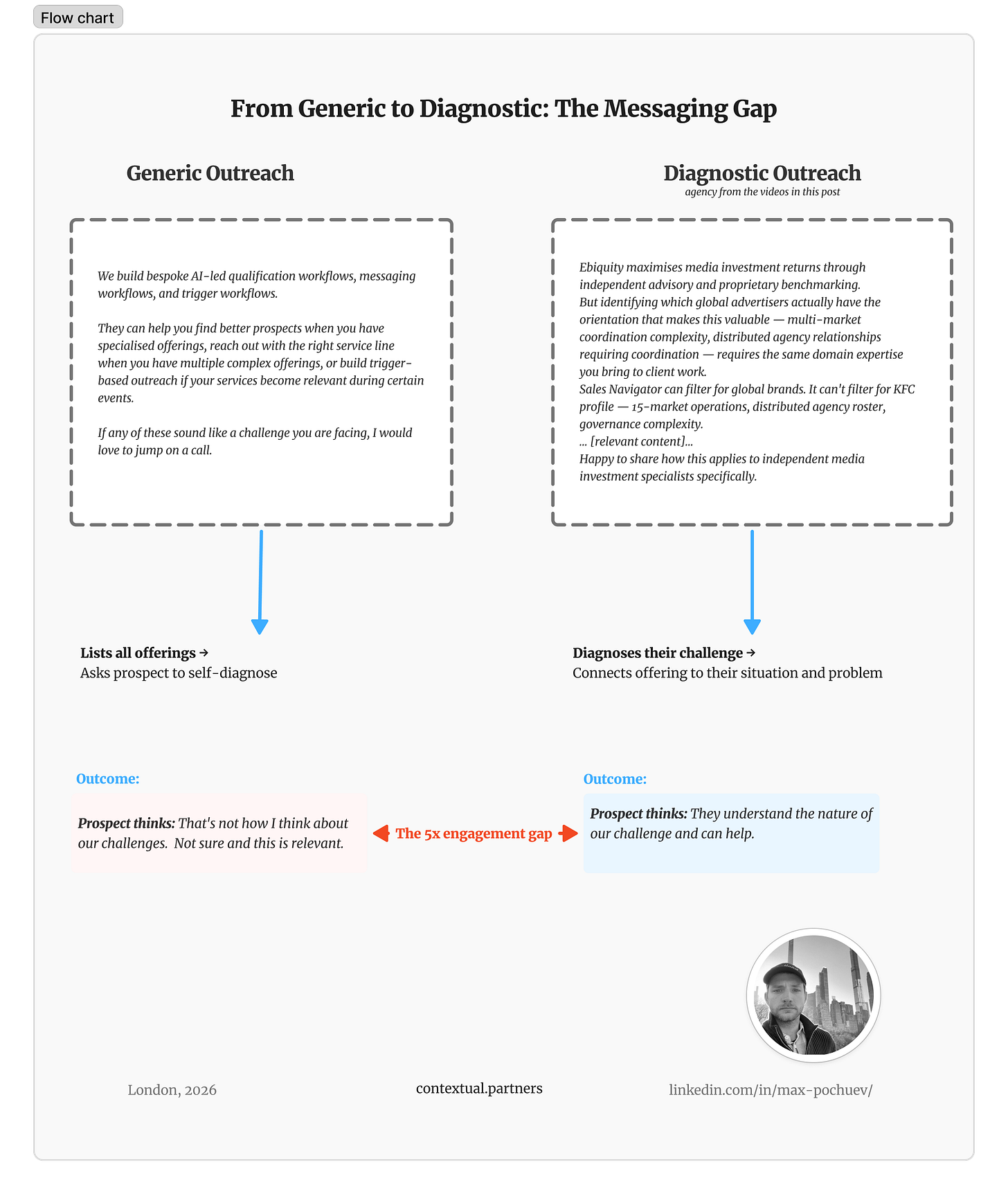 This precision — in diagnosis, in what to emphasise, in what to avoid — is what closes the engagement gap between generic outreach and messaging that demonstrates genuine understanding.