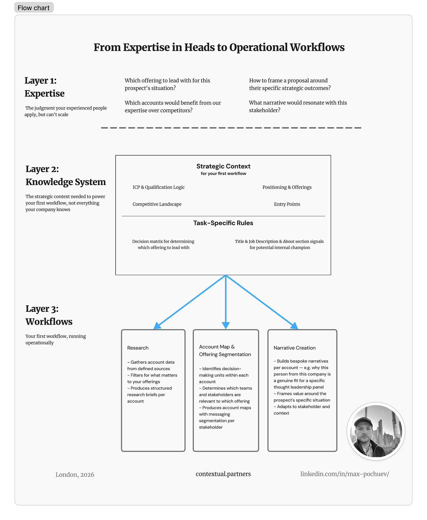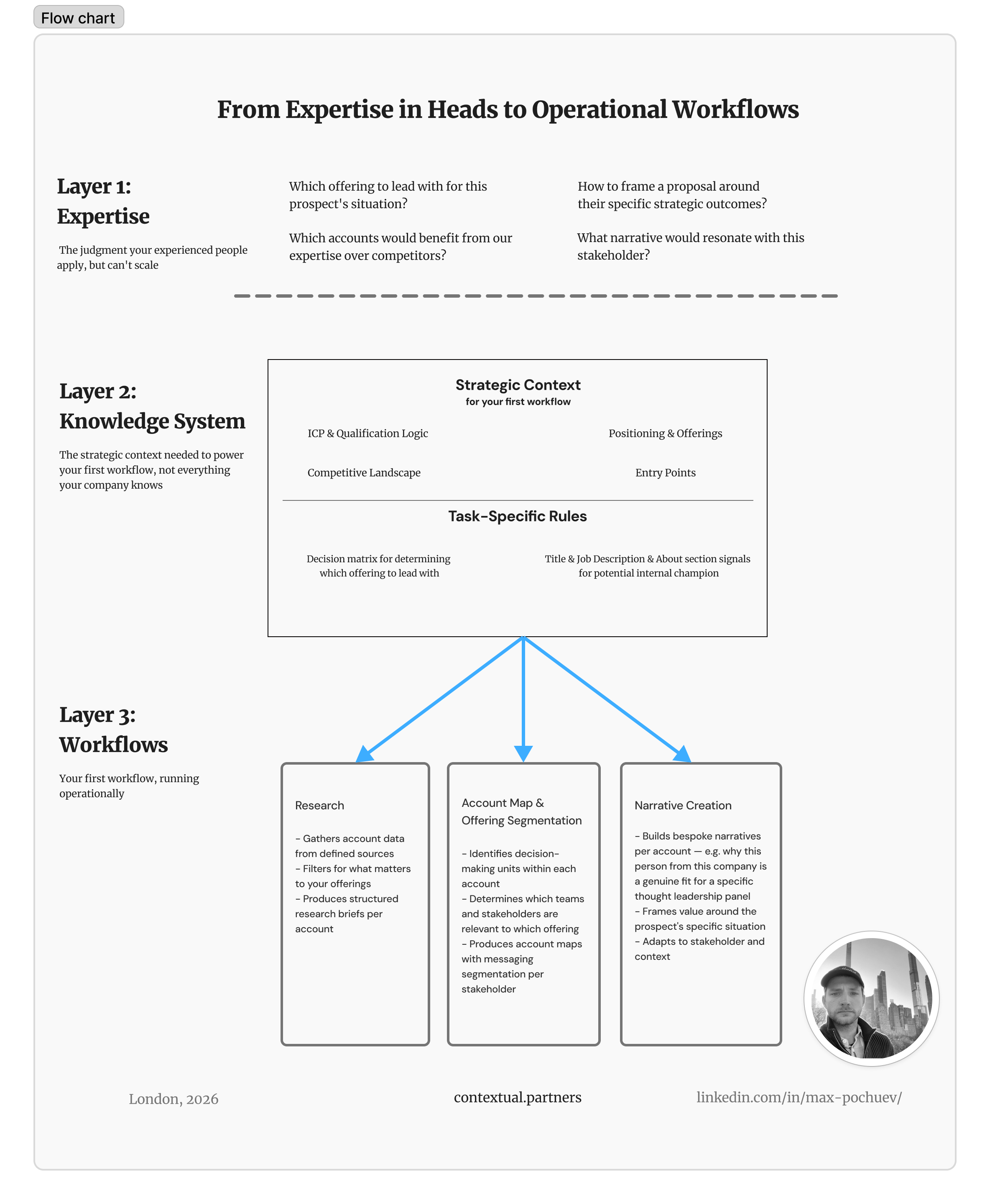 Most of the work — and most of what determines whether this succeeds or fails — sits in the second layer. The workflows are the visible output, but they’re only as good as the knowledge system underneath them.