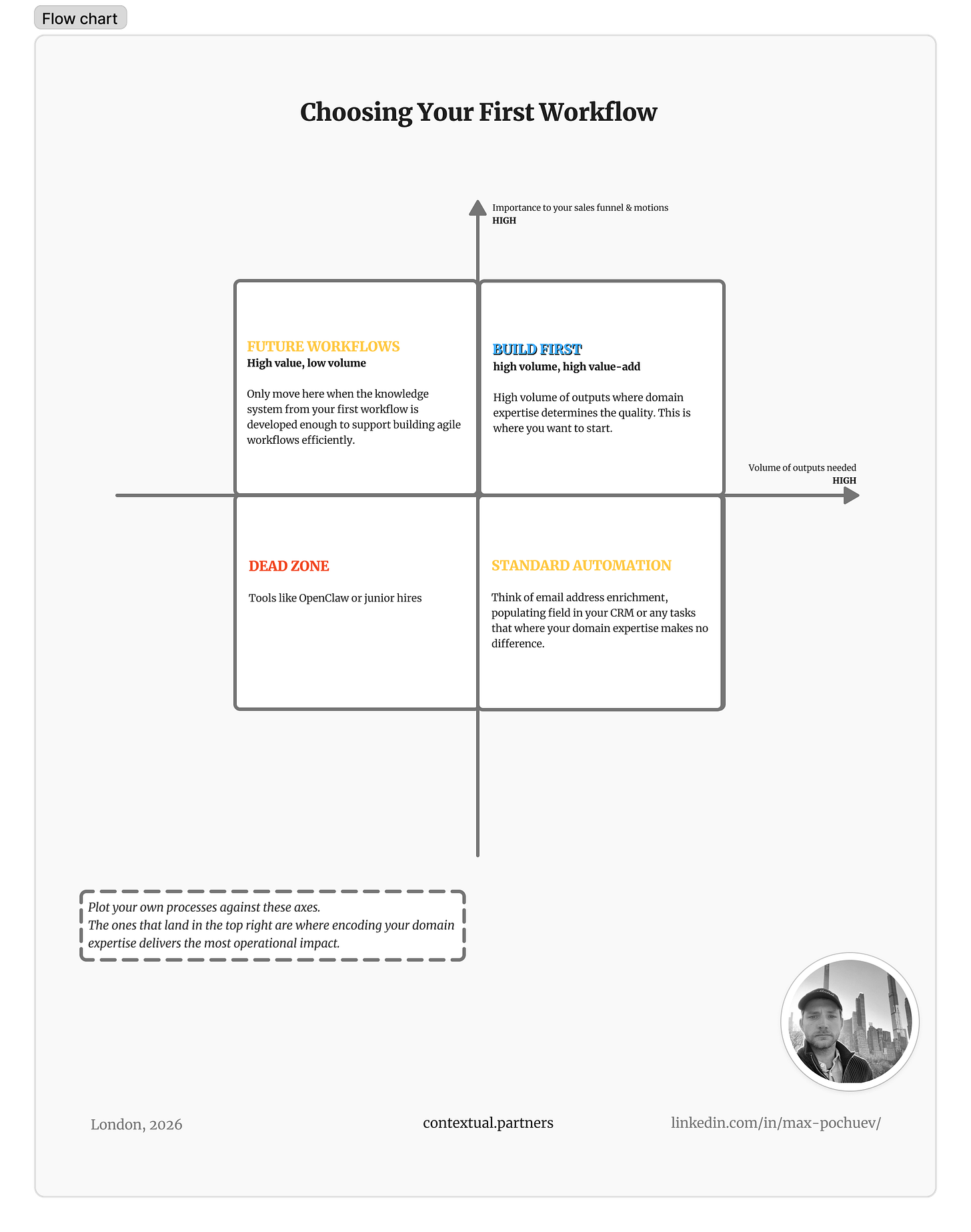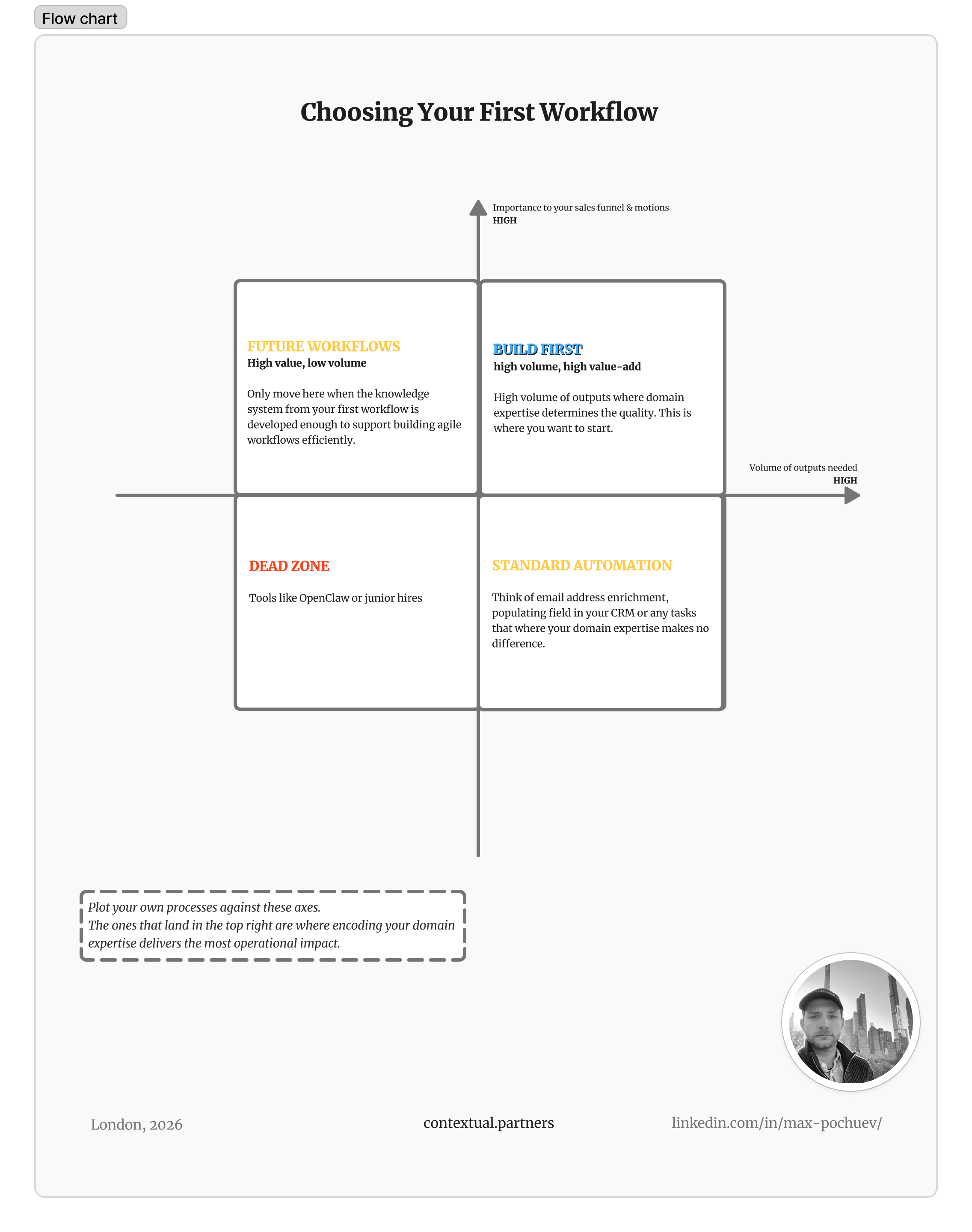 The right first workflow is the process that sits at the intersection of volume, added value, and required domain expertise — where you need a high volume of outputs and where domain judgment is most important to your sales funnel and GTM motion.